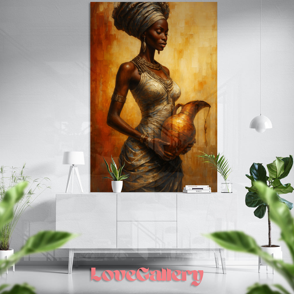 Dompel jezelf onder in de fascinerende wereld van hedendaagse Afrikaanse kunst met dit opvallende portret van een vrouw met een tijdloze schoonheid. Deze illustratie legt de essentie van Afrikaanse vrouwelijkheid vast door een spel van gouden licht en glinsterende texturen die de nobelheid van het onderwerp onthullen.