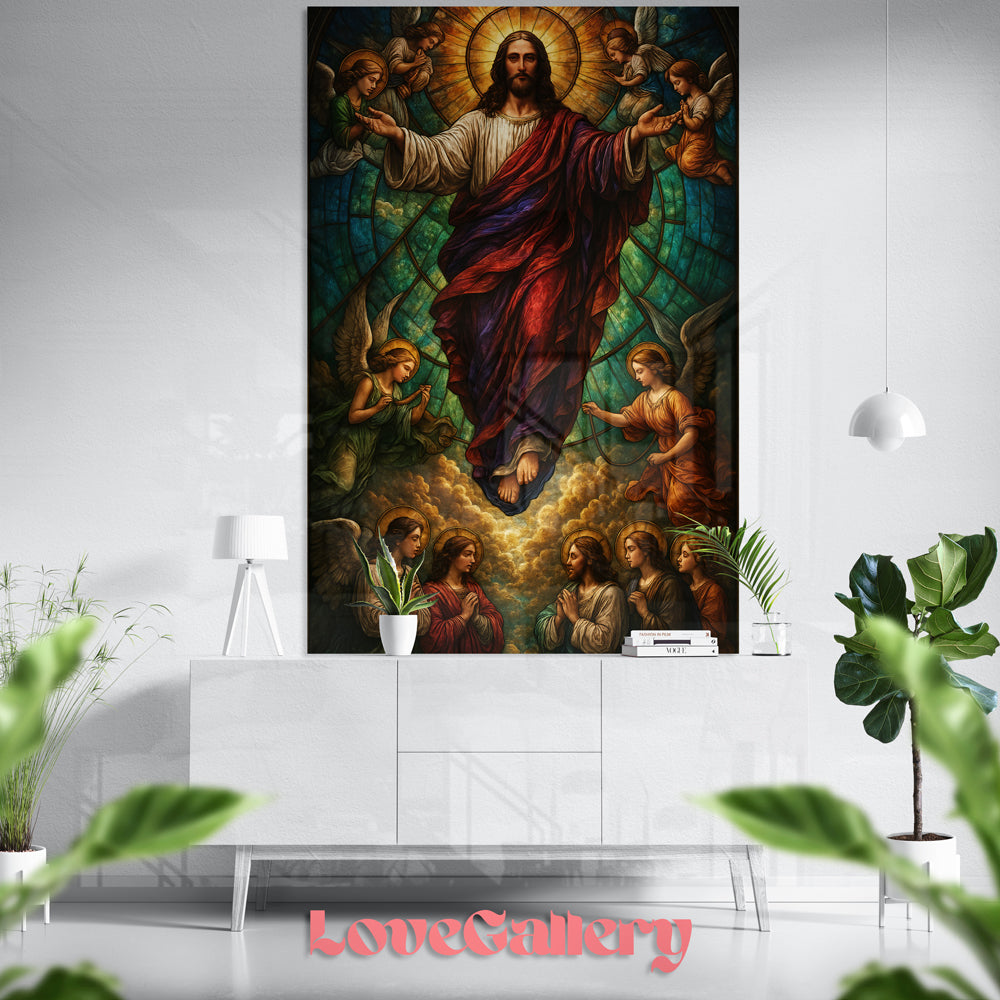 Dit levendige, intense schilderij toont de verrezen Christus die ten hemel stijgt , omringd door een menigte engelen en badend in een oogverblindend gouden licht. Gehuld in een rood-paarse mantel, een symbool van koningschap en opoffering, opent Jezus zijn armen in een gebaar van oneindige liefde. De glas-in-loodachtergrond, in blauwe en smaragdgroene tinten, accentueert de plechtigheid van het moment en de goddelijke opwelling naar eeuwige glorie.