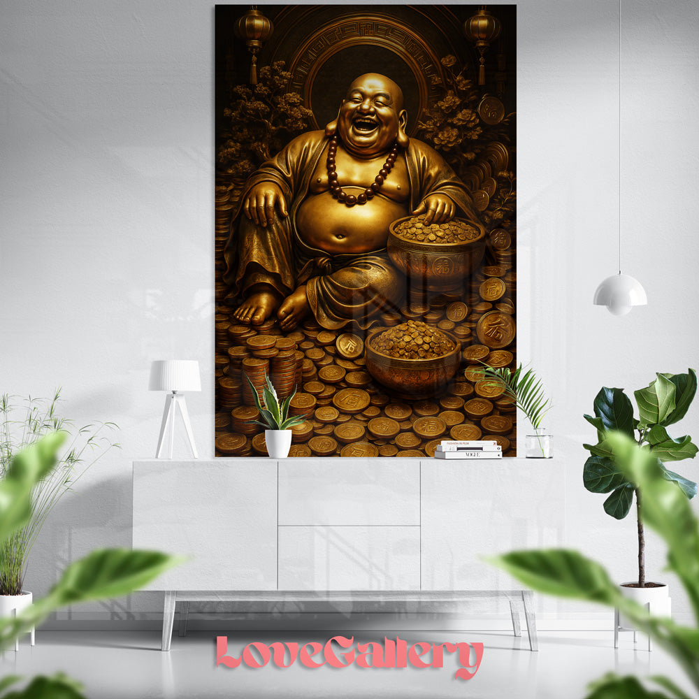 Dit schilderij straalt vreugde en voorspoed uit, belichaamd door de beroemde lachende Boeddha , gezeten in een oceaan van gouden munten. Zijn ontspannen houding, zijn stralende glimlach, zijn kettingen en de weelderige sfeer om hem heen creëren een direct gevoel van welzijn en rijkdom. Deze afbeelding is perfect om positieve energie , geluk en overvloed aan te trekken en tegelijkertijd een vleugje Zen en Aziatische spiritualiteit in uw interieur te brengen.