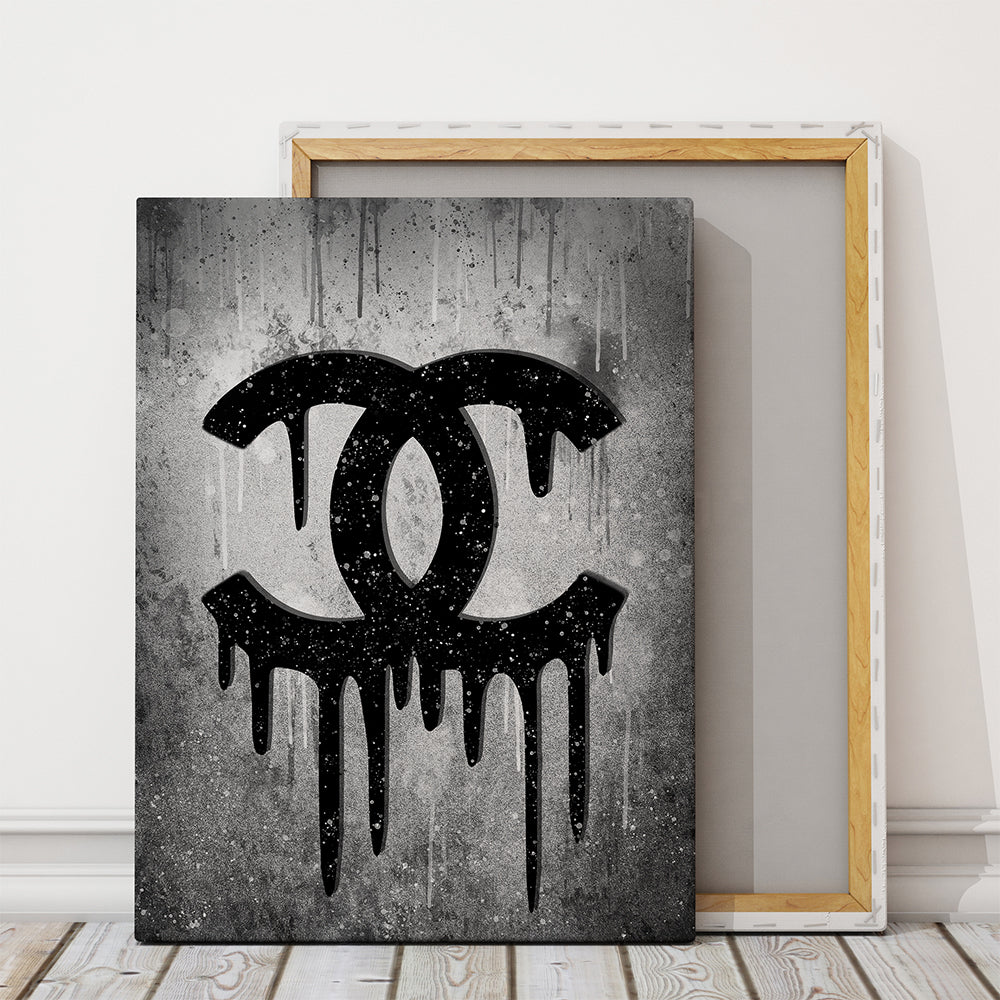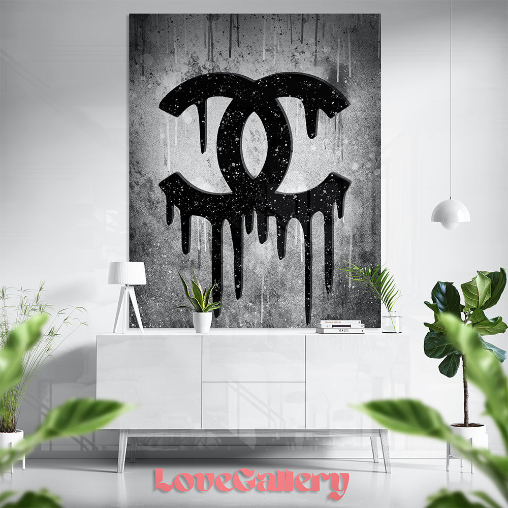 Laat je stijl zien met dit Coco pop-art schilderij , een uniek stuk met een urban en chique esthetiek dat het beroemde dubbele C-logo op een gewaagde manier verdraait. Het mythische symbool, weergegeven in diepzwart, vloeit letterlijk over het canvas, alsof het in het materiaal is versmolten, en roept een fusie op tussen de verfijning van luxe en de rauwe brutaliteit van streetart.
