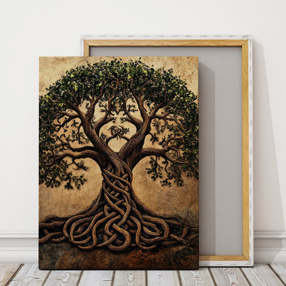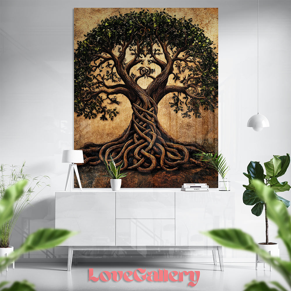 Un mélange entre art celte, gravure médiévale et symbolisme spirituel. Chaque courbe du tronc et chaque feuille sont finement détaillées, offrant un rendu à la fois authentique, spirituel et élégant. Ce tableau attire immédiatement l’œil par sa force symbolique et sa profondeur visuelle.