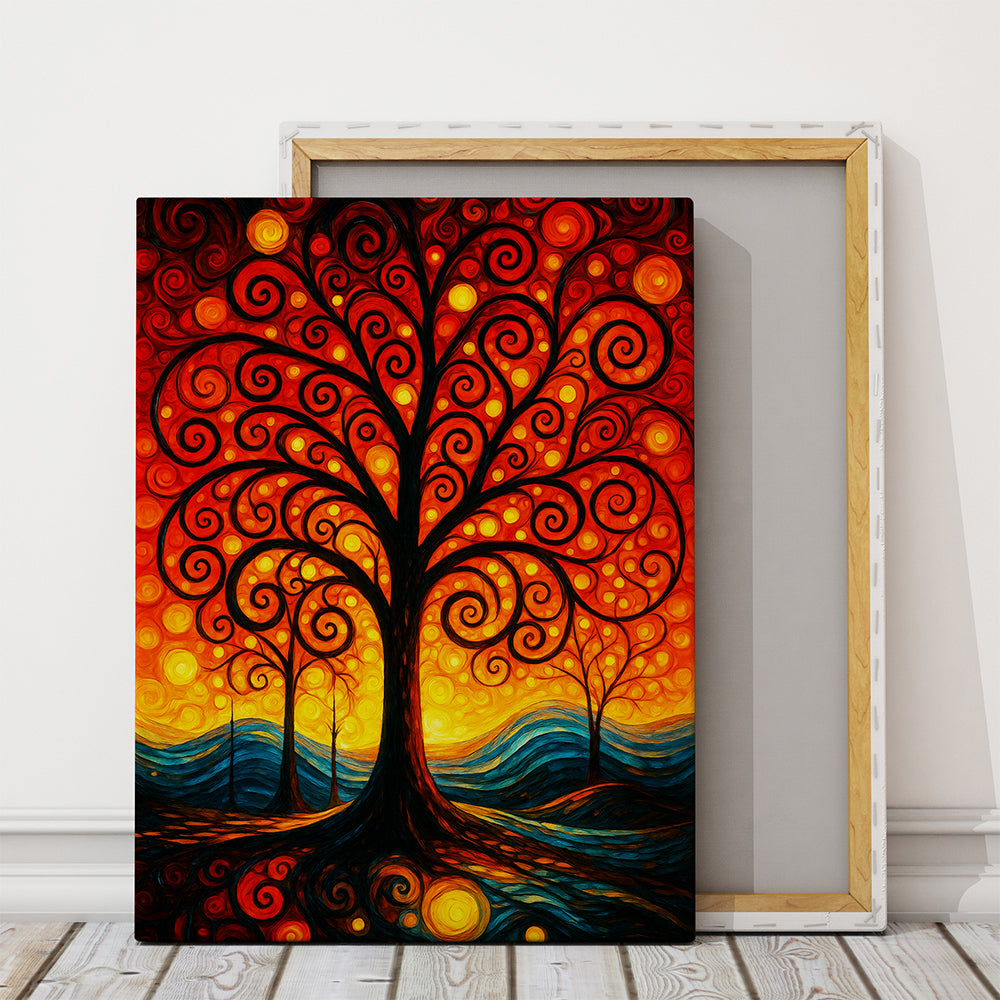 Inspiré par l’univers graphique de Gustav Klimt, ce tableau arbre de vie coloré offre une version moderne et vibrante de ce symbole universel. Le tronc central solide se transforme en un réseau de branches en spirales hypnotiques, sur fond de vagues colorées en dégradé de jaune, orange, rouge et bleu.