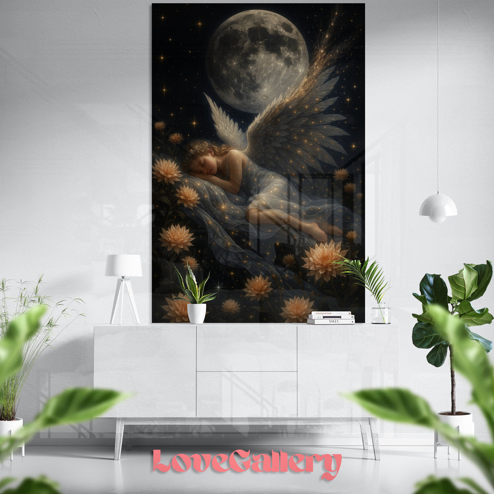 Laissez la magie de la nuit guider vos rêves avec ce tableau céleste d’une douceur infinie. Un ange endormi, bercé par les étoiles et veillé par la Lune, vous transporte dans un monde de paix et de lumière silencieuse.