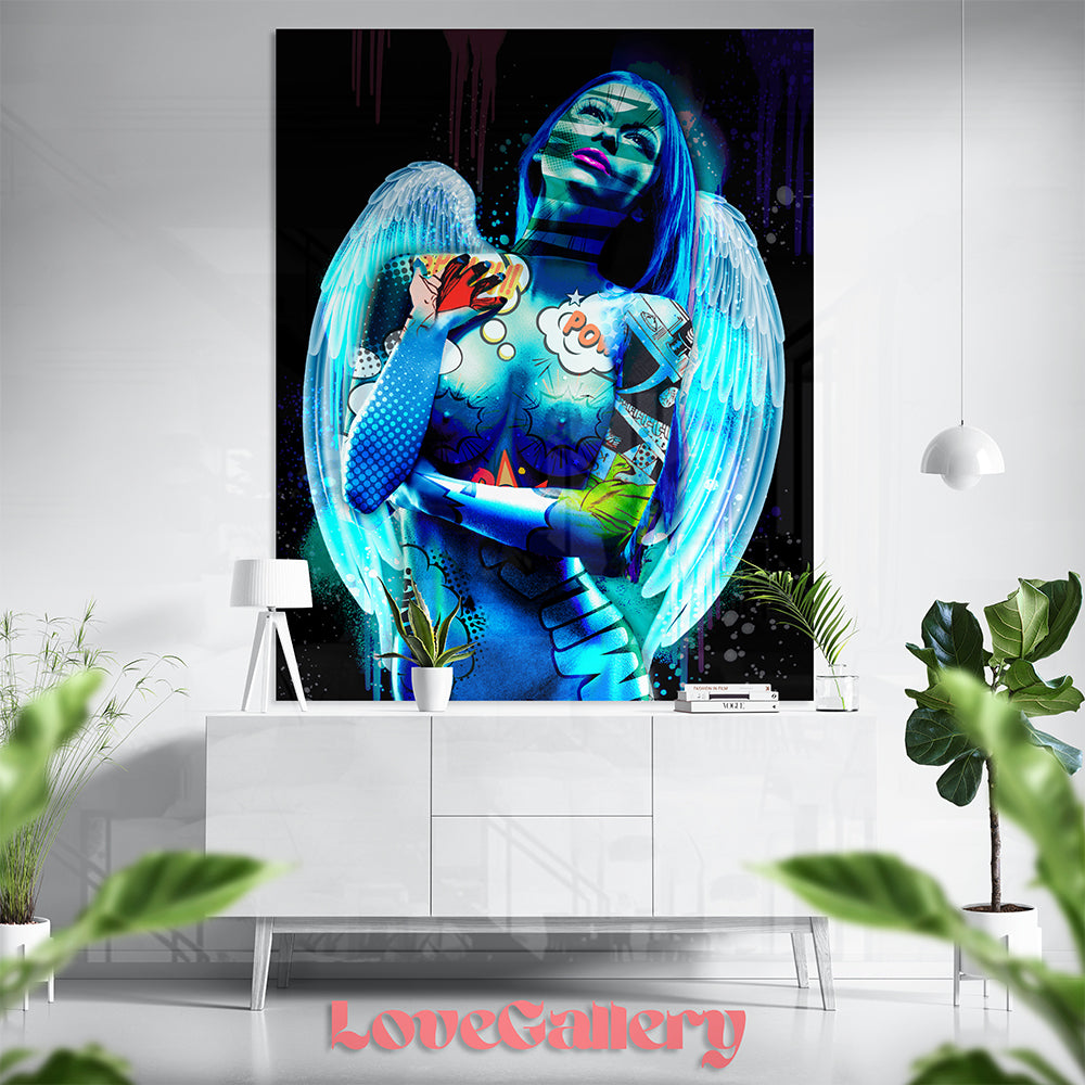 Tableau femme ange sexy pop art – Audace céleste et explosion de couleurs