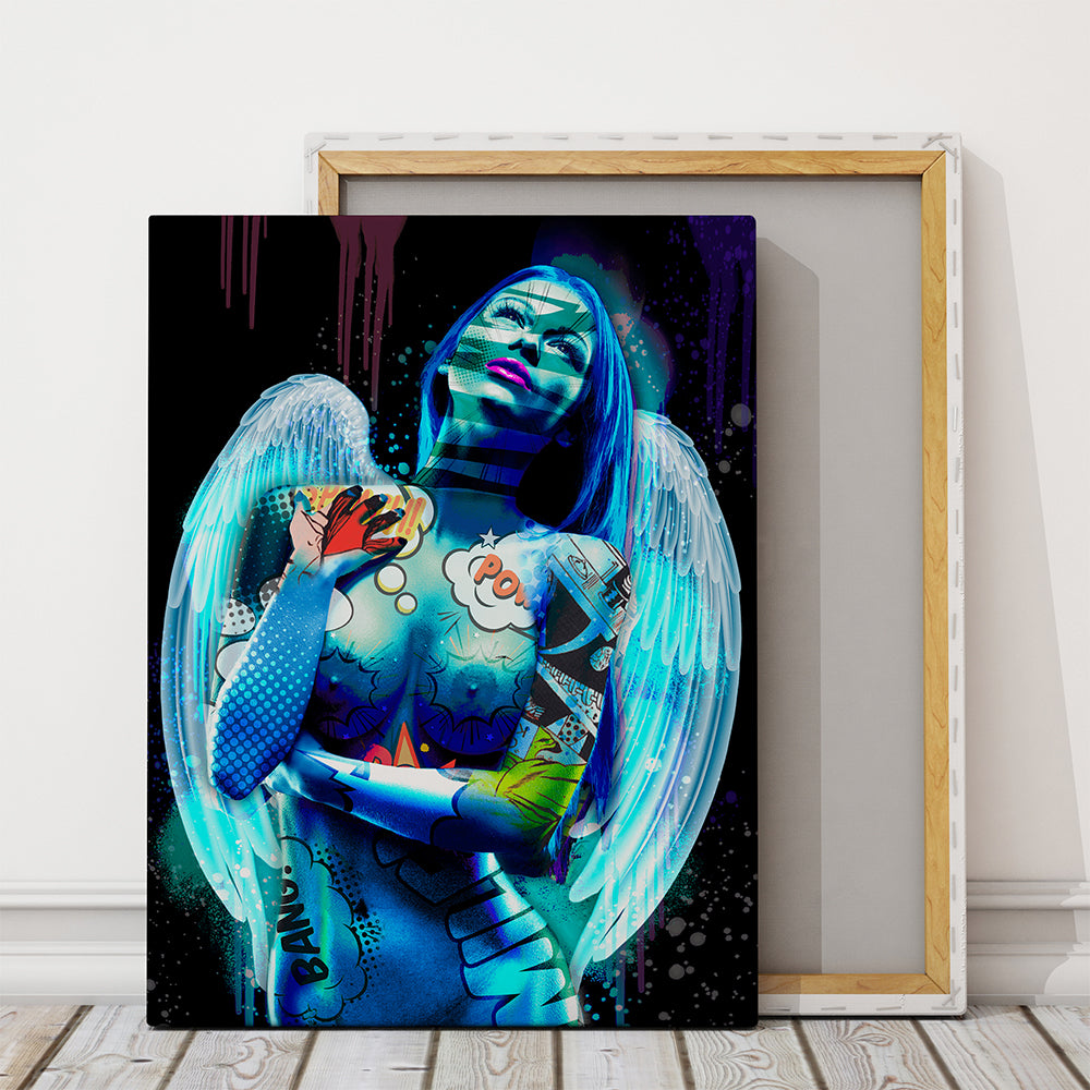 Transformez votre intérieur en une galerie d'art moderne avec ce tableau sur toile de femme ange sexy style pop art. L’illustration met en scène une femme céleste, au regard fier et sensuel, dotée d’ailes angéliques lumineuses aux reflets bleutés. Son corps est entièrement recouvert de motifs pop colorés, typiques du street art, avec des bulles façon comics et des touches de graffiti comme "BANG", "POP", ou des visages stylisés.