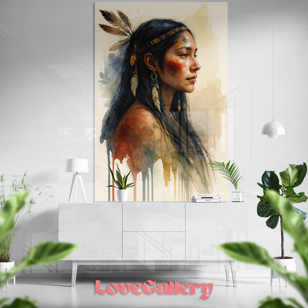 Cette femme, peinte à l’aquarelle dans des teintes naturelles, incarne la connexion à la terre et aux traditions. Son profil calme, ses plumes et ses ornements simples parlent de douceur, de résilience et d’un lien profond avec la nature. Une œuvre apaisante à l’élégance discrète.