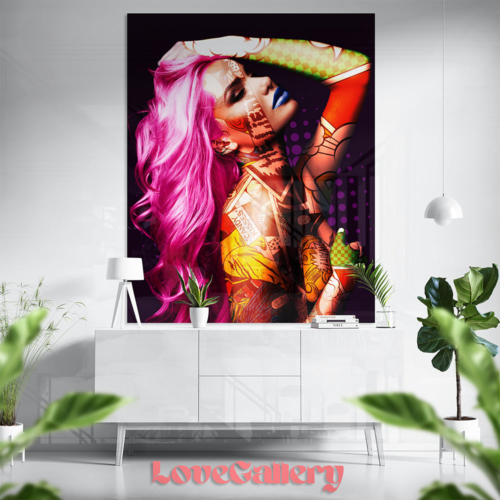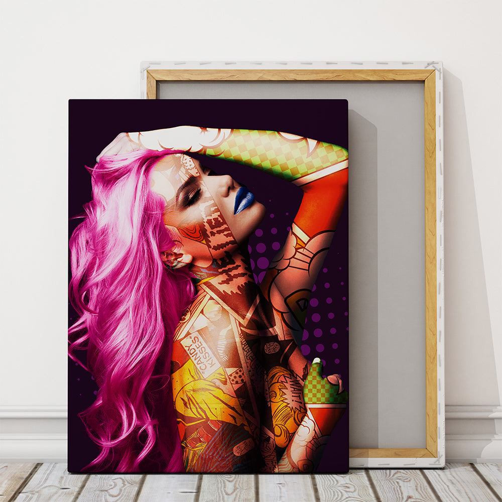Dynamisez votre intérieur grâce à ce tableau femme pop art qui fusionne mode, glamour et audace artistique. Cette toile vibrante met en scène une femme aux cheveux roses flamboyants et aux lèvres bleu électrique, sublimée par un habillage graphique audacieux inspiré du street art et de la bande dessinée.