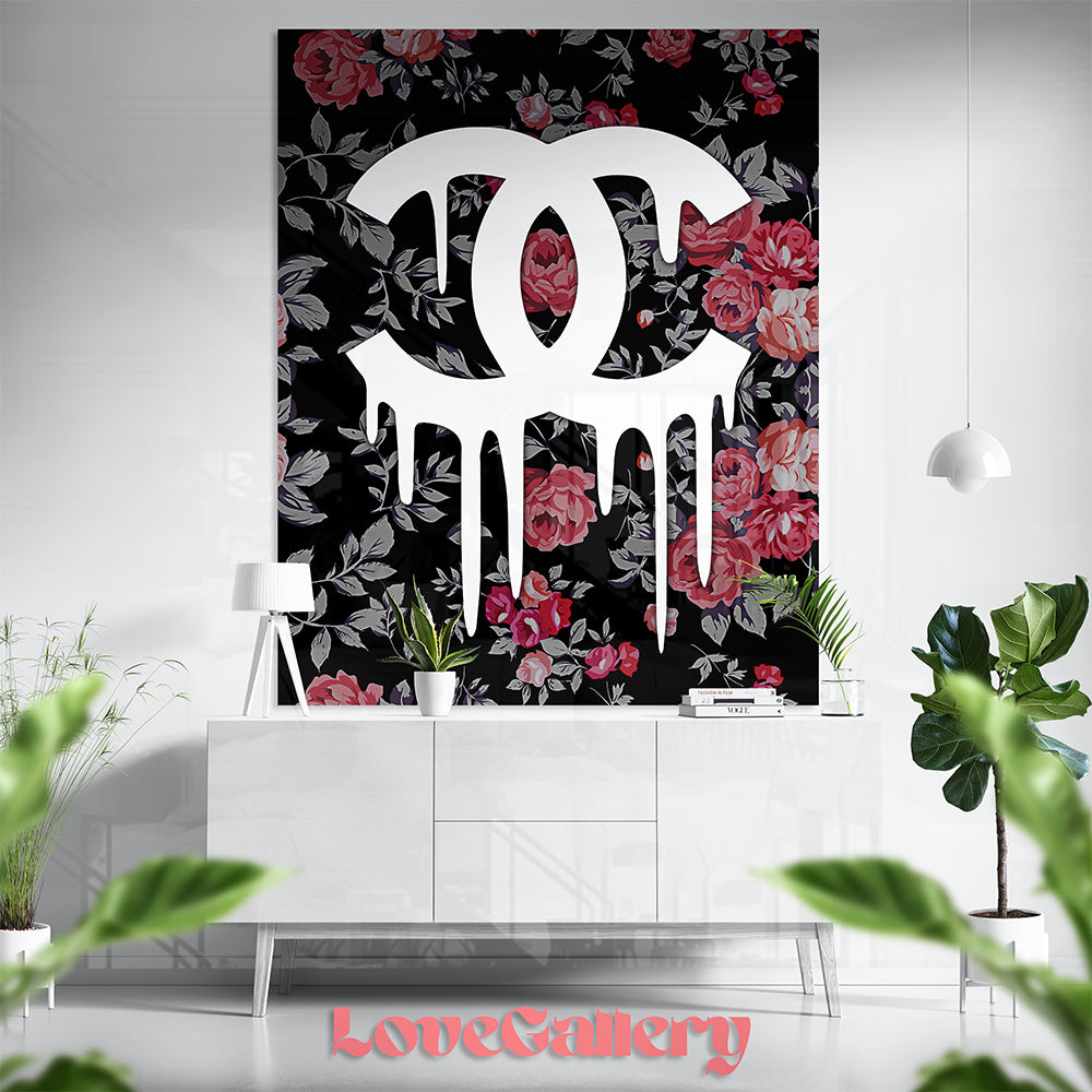 Ajoute une touche de luxe rebelle à ton intérieur avec ce tableau pop art inspiré du célèbre logo Coco, revisité en version drip pour un effet artistique percutant. L’œuvre mêle l’iconique double "C" blanc en fusion à un fond floral sombre et sophistiqué, créant un contraste saisissant entre élégance et audace. Un hommage aux codes du luxe revisités avec une touche contemporaine et provocante.