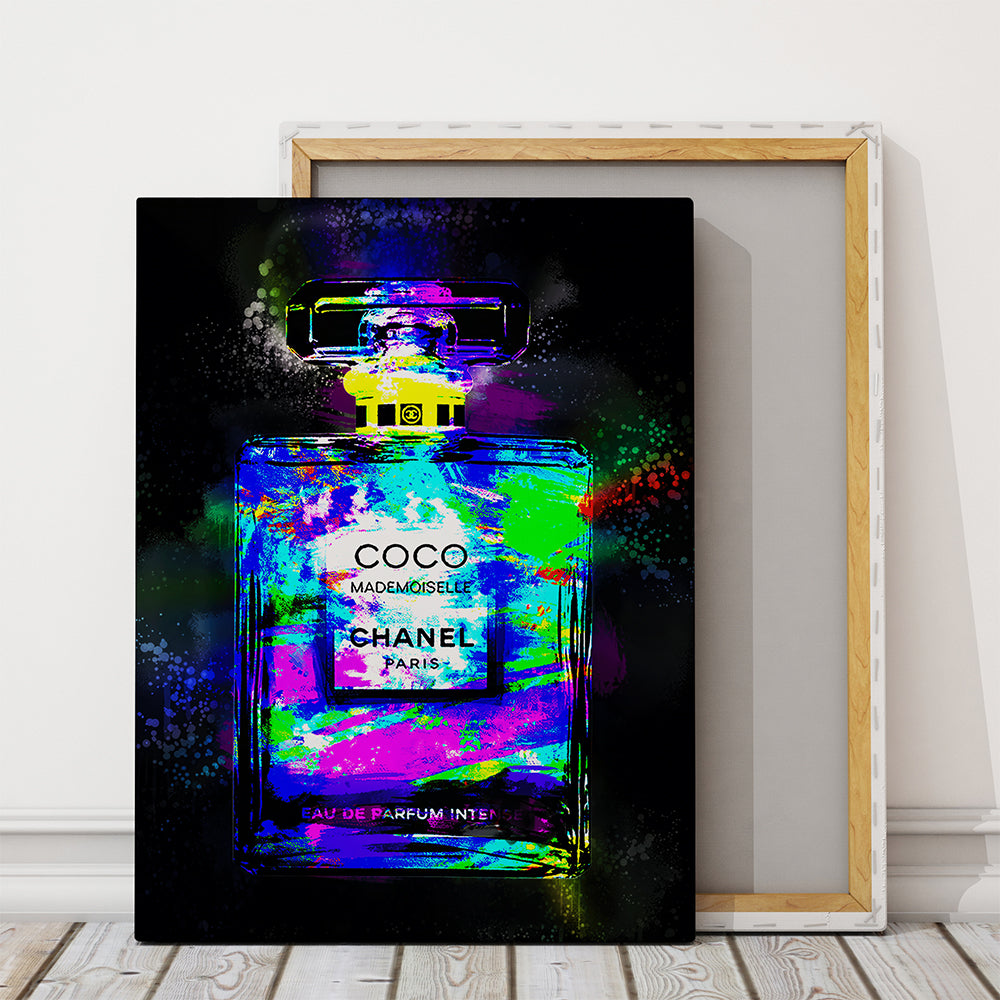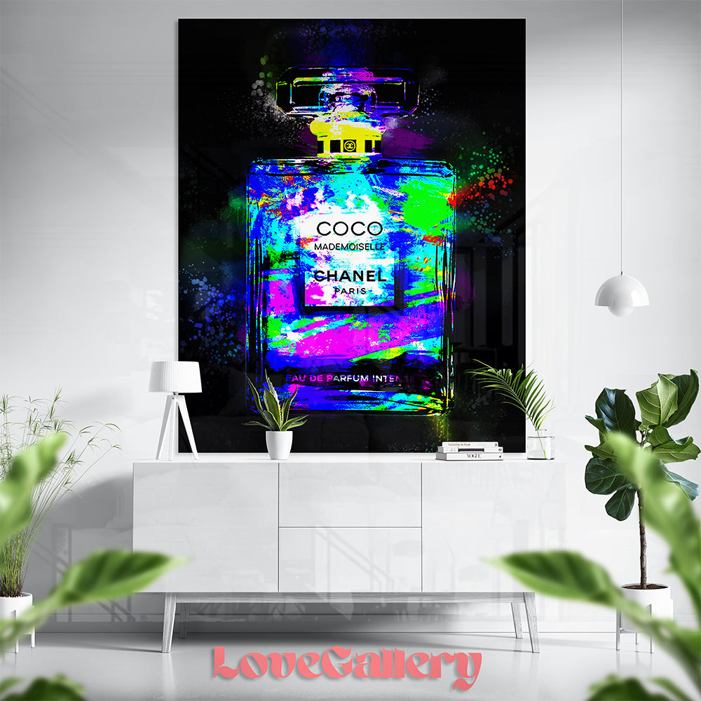 Faites entrer l'élégance iconique de la maison Chanel dans votre intérieur avec ce tableau "Coco Mademoiselle" revisité dans un style pop art explosif. La célèbre bouteille de parfum se pare ici de touches néon éclatantes — violet électrique, vert acide, bleu intense et rose fluo — projetées comme des coups de pinceau rebelles sur un fond noir profond.