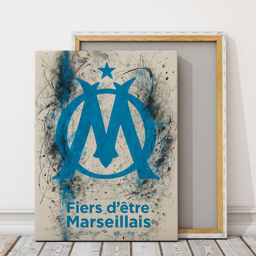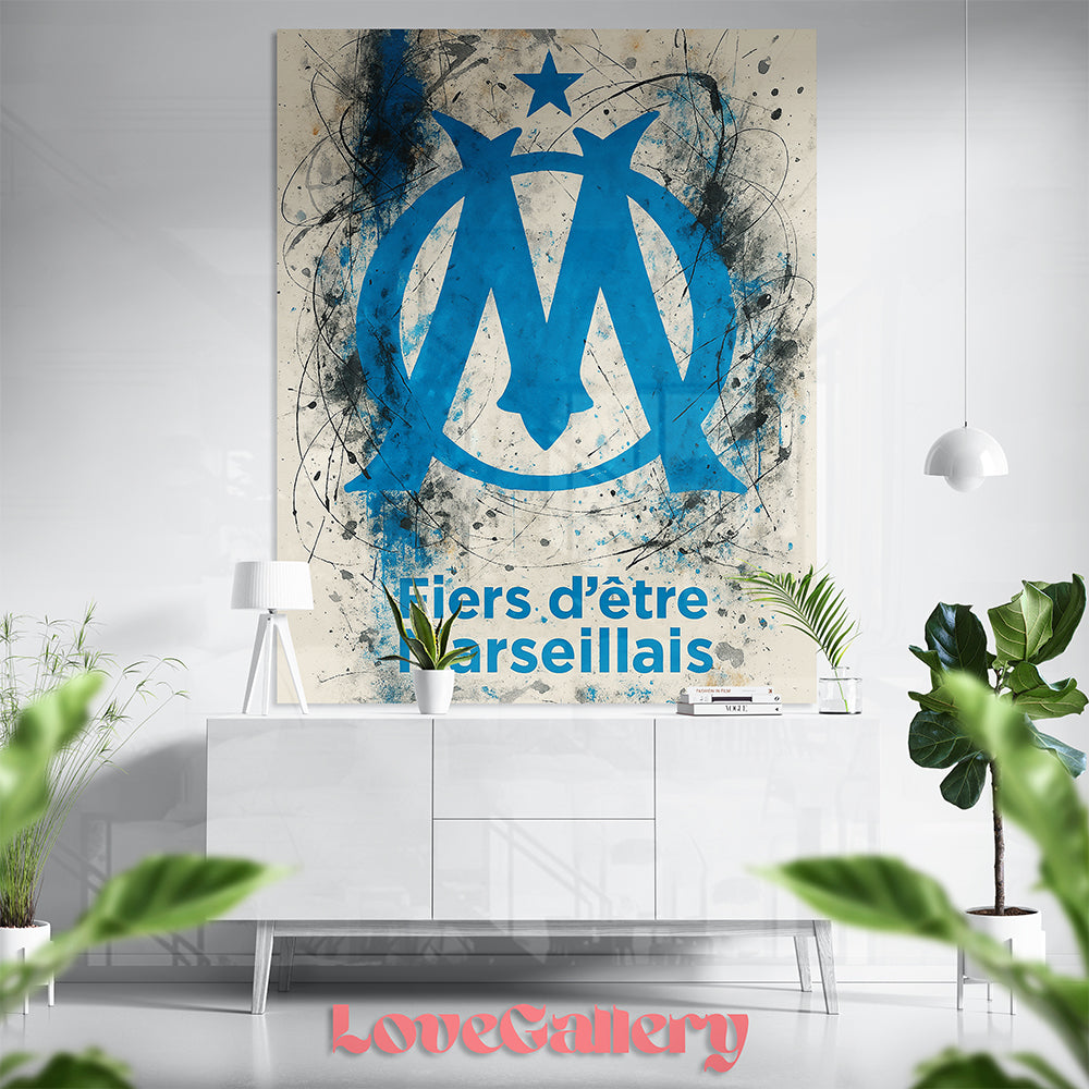 Affirme ta passion pour l’Olympique de Marseille avec ce tableau au style pop art urbain, à la fois percutant et élégant. Sur un fond blanc cassé texturé, le célèbre logo bleu ciel de l’OM s’impose au centre, entouré d’éclaboussures de peinture noire, bleue et grise, dans un esprit graffiti moderne et énergique. L’inscription « Fiers d’être Marseillais » en bas de l'illustration, exprime avec fierté l’amour inconditionnel pour la cité phocéenne et son club légendaire.