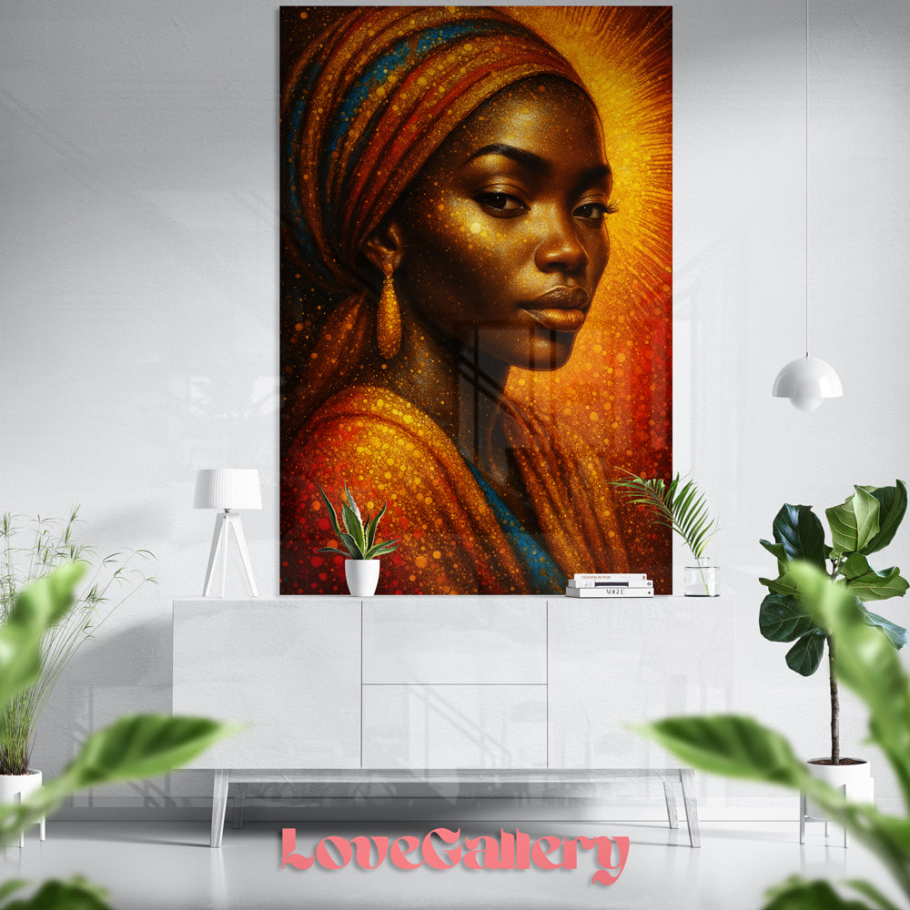 Cette illustration d'art exceptionnelle présente le portrait d'une femme africaine magnifique, enveloppée dans un foulard traditionnel coloré aux nuances chatoyantes. L'artiste a su capturer avec une précision remarquable l'intensité du regard et la noblesse des traits, créant une connexion émotionnelle profonde avec l'observateur. Les tons doré lumineux dominent la composition, créant un effet de halo mystique qui sublime le visage expressif du modèle. Chaque détail est sublimé par des effets de texture pointilliste qui apportent une dimension tactile à l'œuvre. L'arrière-plan rayonnant évoque la chaleur du soleil africain et renforce l'impression de lumière intérieure qui émane du personnage. Les drapés du foulard créent un mouvement fluide qui guide l'œil vers le visage serein et contemplatif. Cette représentation moderne de la beauté africaine authentique mélange harmonieusement tradition et innovation artistique. L'utilisation magistrale des ombres et des lumières confère une profondeur saisissante qui donne vie au portrait. Un véritable hymne à la beauté universelle qui transcende les frontières et les époques.