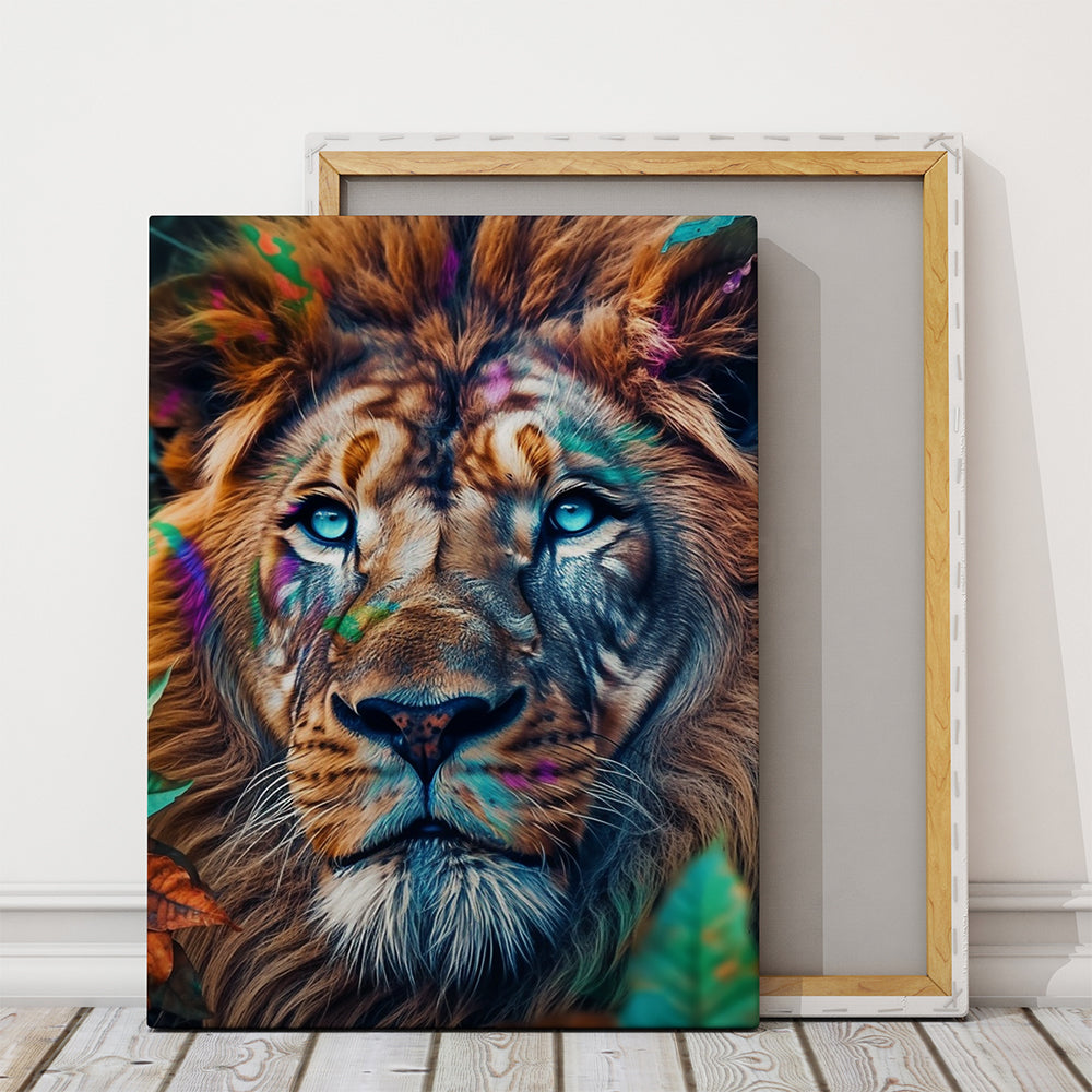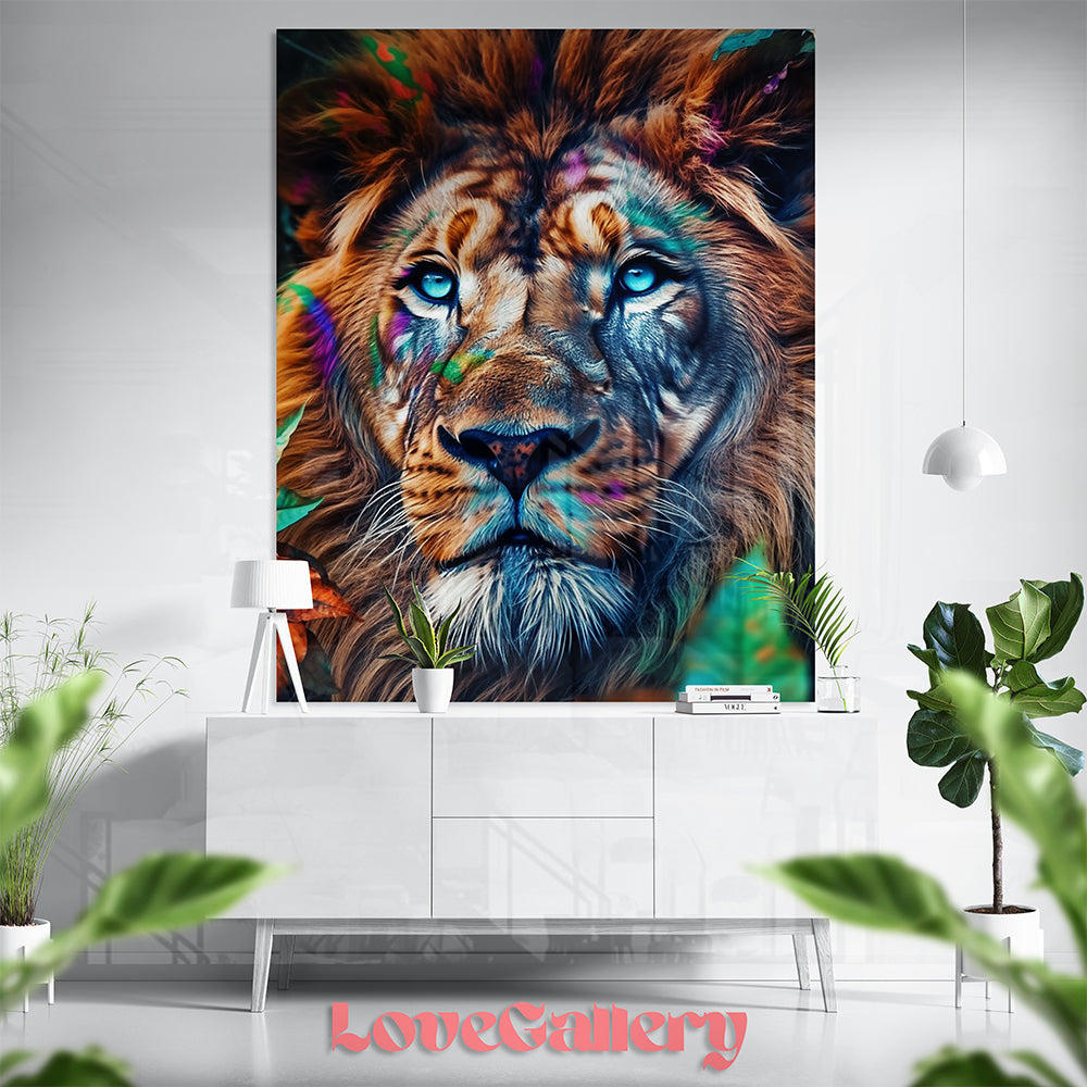 Ce tableau tête de lion met en scène le félin le plus majestueux dans toute sa splendeur. Son regard bleu perçant capte immédiatement l’attention, tandis que son pelage réaliste est rehaussé de touches colorées subtiles, apportant une touche artistique moderne à une représentation animale puissante.
