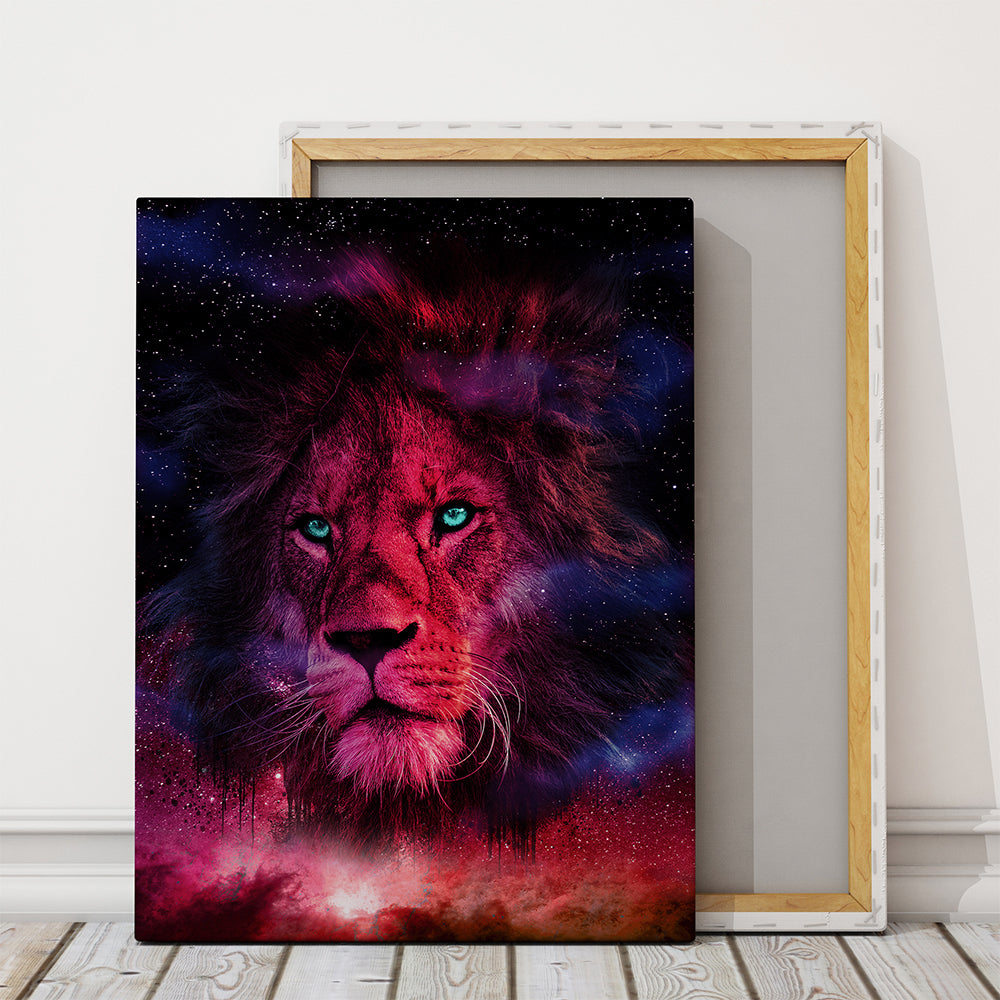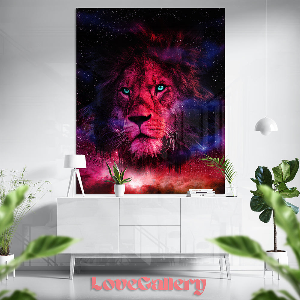 La crinière, épaisse et sauvage, fusionne avec un fond galactique impressionnant : étoiles scintillantes, voiles nébuleux violets, éclats interstellaires et coulures artistiques évoquent un univers infini, où le roi des animaux règne sans partage. Chaque détail est travaillé avec précision pour créer une atmosphère à la fois majestueuse, spirituelle et contemporaine.