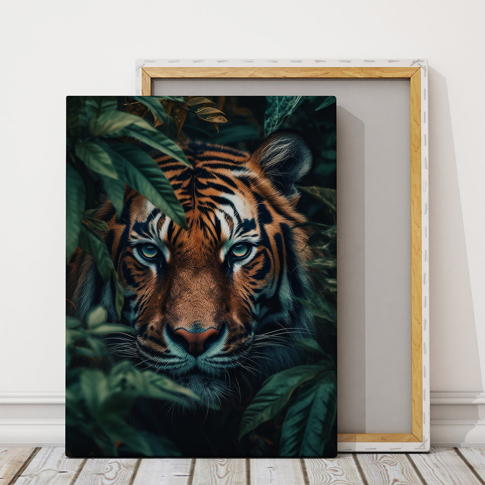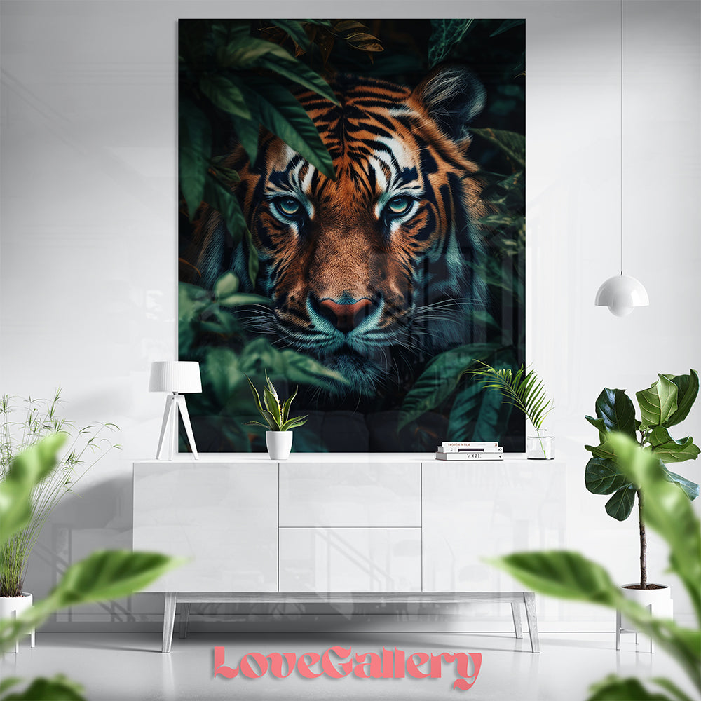 Ce tableau hyperréaliste capture un tigre majestueux en plein cœur de la jungle. Son regard perçant d’un bleu profond transperce la végétation luxuriante, créant une scène à la fois intense, mystérieuse et pleine de force animale.