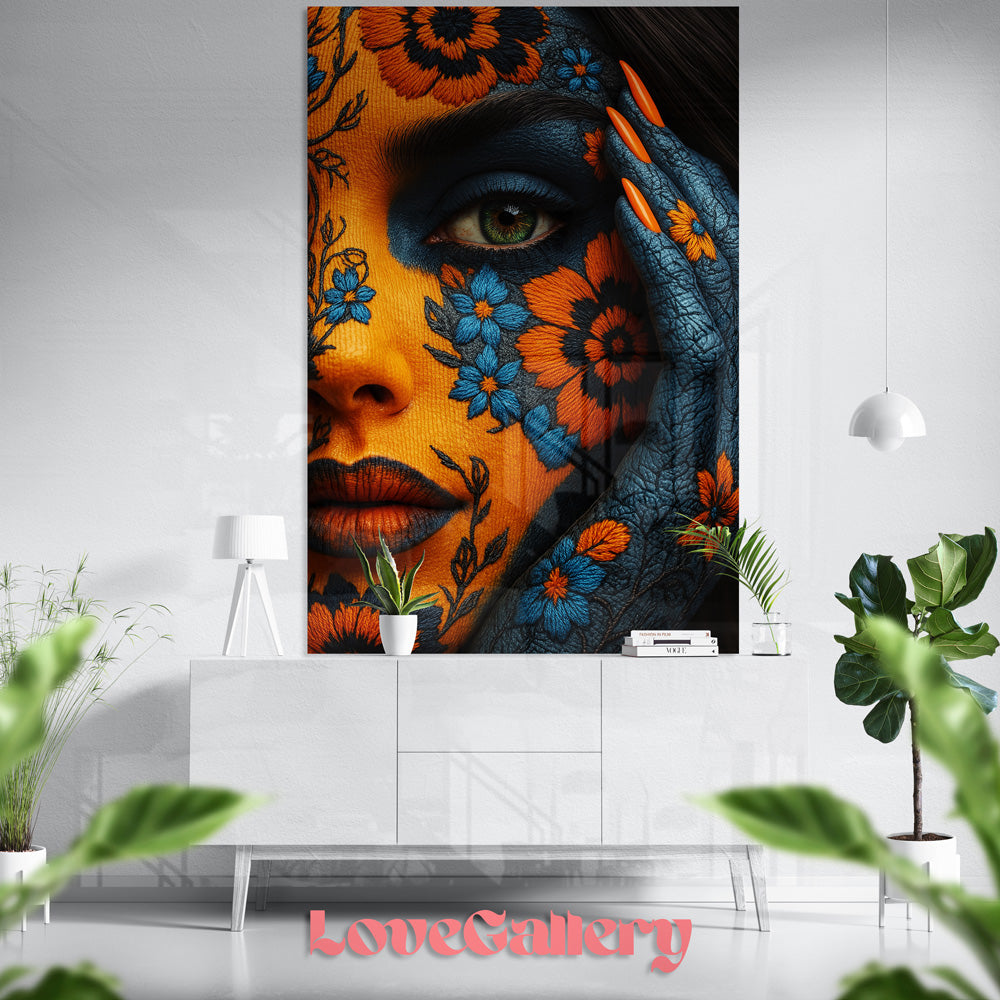 Le visage de la femme, entièrement texturé comme du cuir, est orné de motifs floraux orange et bleus d’une précision exceptionnelle. L’œil central, vert émeraude et profondément expressif, devient le point d’ancrage émotionnel de cette œuvre. Les fleurs brodées s’étendent sur son visage et sa main, créant un effet sensoriel presque palpable. Les couleurs vives, l’orange incandescent et le bleu électrique, s’opposent avec harmonie sur un fond noir texturé, rendant la scène à la fois puissante et poétique. Ce tableau évoque la transformation, la force de la nature et la beauté sauvage féminine. Idéal pour une décoration audacieuse, artistique ou bohème chic, il deviendra une pièce forte dans un salon, une chambre ou un studio créatif.